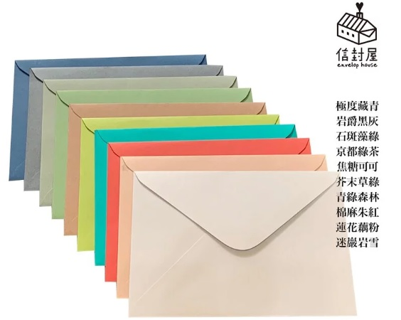 宇建創意(信封屋)信封顏色多達30幾種,有四種尺寸(11.5*16公分、11.5*23公分、14*20.5公分、16.8*16.8公分),